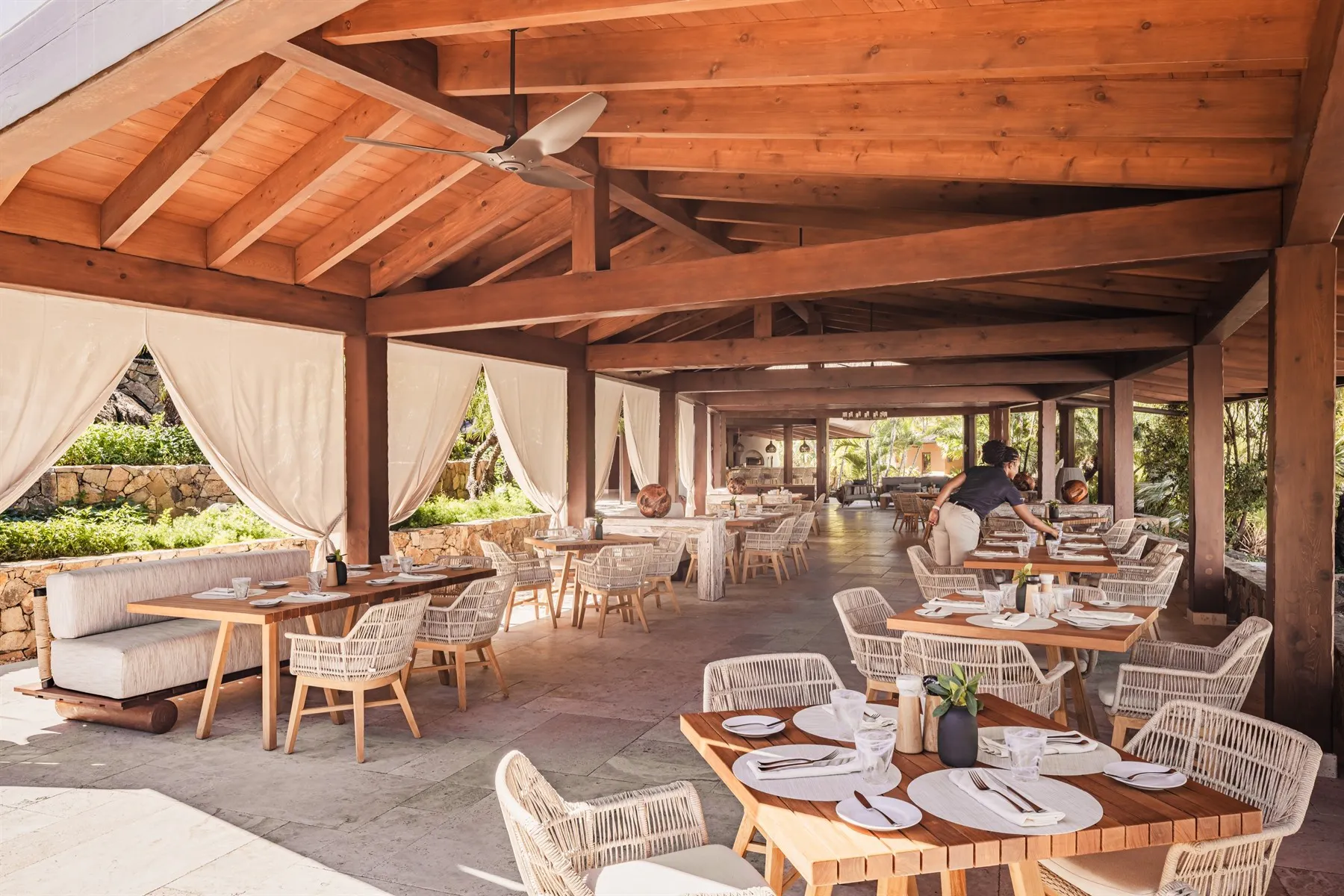 The suites and villas feature king-size bedrooms, ensuite bathrooms and spacious living areas that open onto terraces or pools with dramatic Caribbean views. If you’re seeking a secluded one-bedroom hideaway or the seven-bedroom Casino Royale estate, you’re treated to a personal oasis.